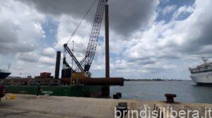Una gru speciale su pontone, dotata di vibro-infissore, infigge a -43 metri dal livello medio mare i pali metallici. Inizia una nuova era per lo scalo messapico.