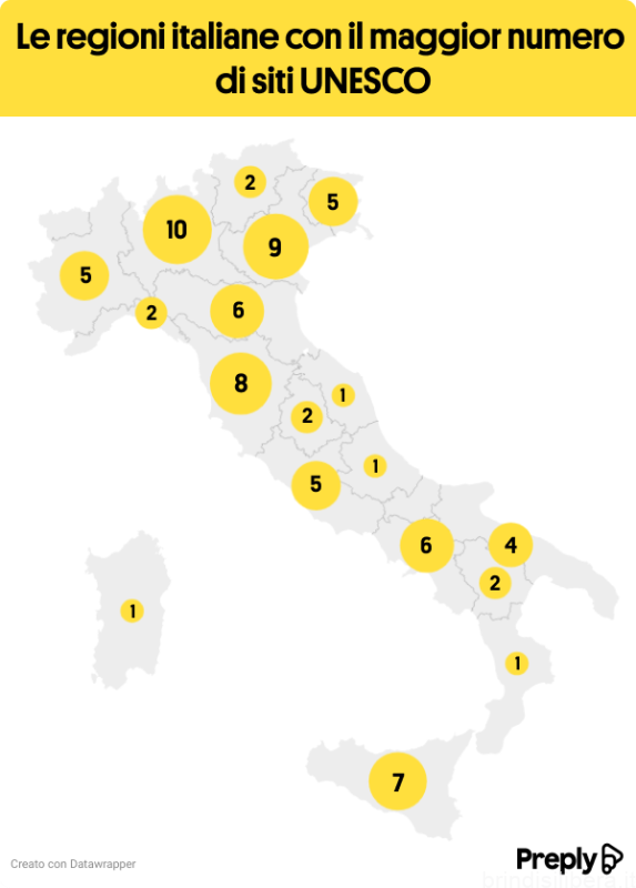 I siti patrimonio Unesco giocano un ruolo fondamentale nel preservare e promuovere la cultura di un luogo. Questi siti rappresentano le radici storiche, artistiche e naturali di una nazione, custodendo le tradizioni e le storie che hanno plasmato le comunità nel corso dei secoli. Attraverso la sua ricerca, Preply ha focalizzato l’attenzione su scala mondiale e nazionale, individuando i paesi e le regioni italiane con il maggior numero di siti Unesco.