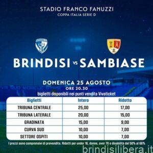 I biglietti della gara Brindisi FC – Sambiase, valida per il turno preliminare di Coppa Italia di serie D, in programma domenica 25 agosto al “Fanuzzi” di Brindisi alle ore 20.30, sono disponibili presso le rivendite autorizzate Vivaticket, presenti in città e in provincia. Appena possibile sarà attivata anche l’opzione di acquisto online con link diretto al portale Vivaticket.