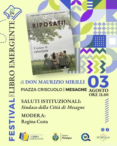 Nuovo appuntamento con il Festival del Libro Emergente: nei pressi del bookcrossing “Letti e Riletti” – in piazza Criscuolo dalle ore 21 – don Maurizio Mirilli presenta il suo ultimo libro, “Riposati! È tempo di relazione”, scritto a più mani con Angela Basile e Sonia Vazzano. L’incontro è patrocinato dall’Amministrazione comunale nell’ambito del cartellone “Mesagne Estate 2024”.