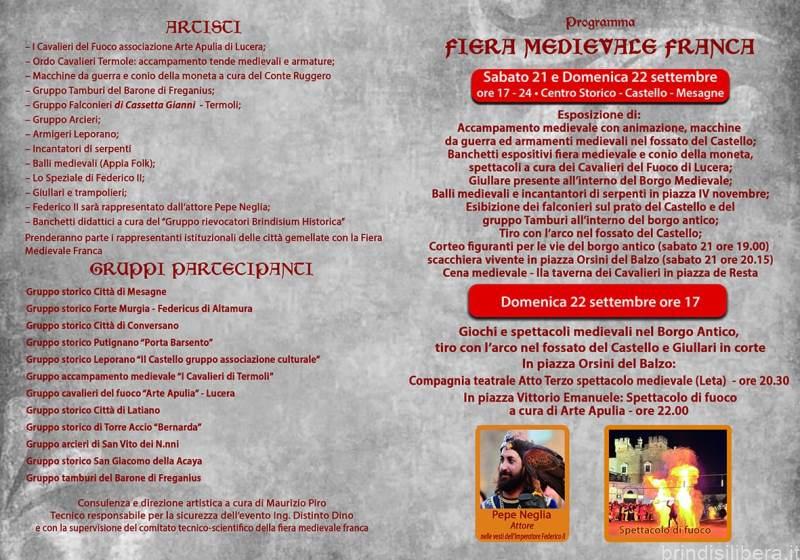 dei soldati, per poi imbarcarsi dai porti di Siponto, Barletta, Trani, Bari, Brindisi e Otranto, per il loro voto di crociata”. E continuano a fornire dettagli sul perché di una rievocazione storica in grande stile che negli anni ha fatto crescere il sostegno istituzionale – può contare sul patrocinio del MiC, di Regione Puglia e città di Mesagne – di privati, insieme all’adesione di numerosi gruppi storici provenienti da diverse regioni del Sul Italia. «Poiché la frequenza dei forestieri cresceva di anno in anno – ricordano i promotori – i mesagnesi presero l’abitudine di far mostra dei prodotti della loro ricca terra. Da qui ebbero origine due celebri mercati, che furono poi trasformati in pubbliche fiere dall’Imperatore Federico II, a seguito di una petizione dell’università di Mesagne. Infatti, negli anni dal 1221 al 1229 il grande imperatore svevo dimorò a Brindisi sia per sposare la figlia del Re di Gerusalemme che per preparare una nuova crociata. Federico, per ringraziarli concesse uno speciale privilegio». Dopo la sua morte, l’esenzione sarebbe stata riconfermata dal figlio prediletto, Manfredi Svevo, e dal 1263 i due importanti mercati furono dichiarati fiere franche da tasse.