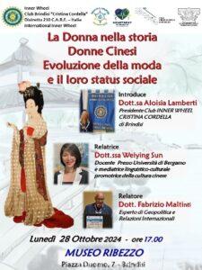 Degno di nota l’interessante evento realizzato dall’Inner Wheel Club Brindisi “Cristina Cordella” in collaborazione con il Polo Biblio Museale di Brindisi, il 28 Ottobre, presso il Museo Archeologico Francesco Ribezzo, dal titolo “LA DONNA NELLA STORIA, DONNE CINESI, EVOLUZIONE DELLA MODA E IL LORO STATUS SOCIALE”.
