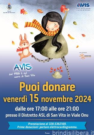 L’Avis Comunale di San Vito dei Normanni, in collaborazione con Centro trasfusionale di Brindisi e col sostegno diFONDAZIONE con il SUD, organizza per VENERDI’ 15 NOVEMBRE 2024 una raccolta di sangue dalle ore 17.00 alle ore 21.00 presso ASL, Viale O N U.