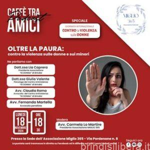 LUNEDI’ 18 NOVEMBRE 2024, ALLE ORE 18:30, PRESSO LA SEDE DELL’ASSOCIAZIONE (VIA PORDENONE N.8 – BRINDISI), NELL’AMBITO DEL PODCAST “CAFFE’ TRA AMICI”, IN OCCASIONE DELLA GIORNATA INTERNAZIONALE CONTRO LA VIOLENZA SULLE DONNE, SI PARLERA’ DI VIOLENZA SULLE DONNE E SUI MINORI.