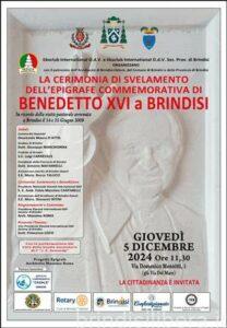 Giovedì 5 dicembre,ci sarà la Cerimonia di Svelamento dell’Epigrafe Commemorativa di Benedetto XV in ricordo della visita pastorale avvenuta a Brindisi il 14 e 15 giugno 2008, organizzata da Ekoclub International Nazionale e Ekoclub International sez .provinciale di Brindisi, con il patrocinio dell’Arcidiocesi Brindisi-Ostuni,il Comune di Brindisi, la Provincia di Brindisi.