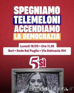 Lunedì 19 maggio alle ore 11:30, il Partito Democratico della Puglia, guidato dal segretario regionale Domenico De Santis, organizzerà un presidio davanti alla sede Rai di via Dalmazia 104, a Bari. L’iniziativa si inserisce all’interno della mobilitazione nazionale promossa dal Partito Democratico per protestare contro il blackout informativo in corso sui referendum dell’8 e 9 giugno.