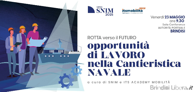 Venerdì 23 maggio, alle ore 9.30, nella Sala conferenze dell’Autorità Portuale di Brindisi, avrà luogo un convegno sul tema “Rotta verso il futuro – Opportunità di lavoro nella Cantieristica Navale”.