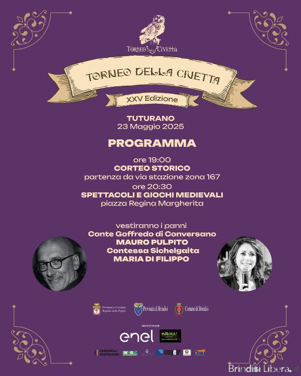 Venerdì 23 maggio si svolgerà la 25^ edizione del corteo storico del “Torneo della Civetta” che vedrà come ospiti della serata Mauro Pulpito (che vestirà i panni del Conte Goffredo di Conversano) e Maria Di Filippo (che interpreterà la Contessa Sichelgaita). Si tratta di un evento che richiama le attenzioni di figuranti e spettatori provenienti da ogni parte della Puglia.