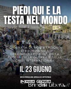 Il Partito Democratico della Puglia e i Giovani Democratici della Puglia organizzano per Lunedì 23 giugno una giornata straordinaria di mobilitazione, dal titolo “Piedi qui e la testa nel mondo”, dedicata alla riflessione sulle guerre e le crisi internazionali che segnano il nostro tempo.