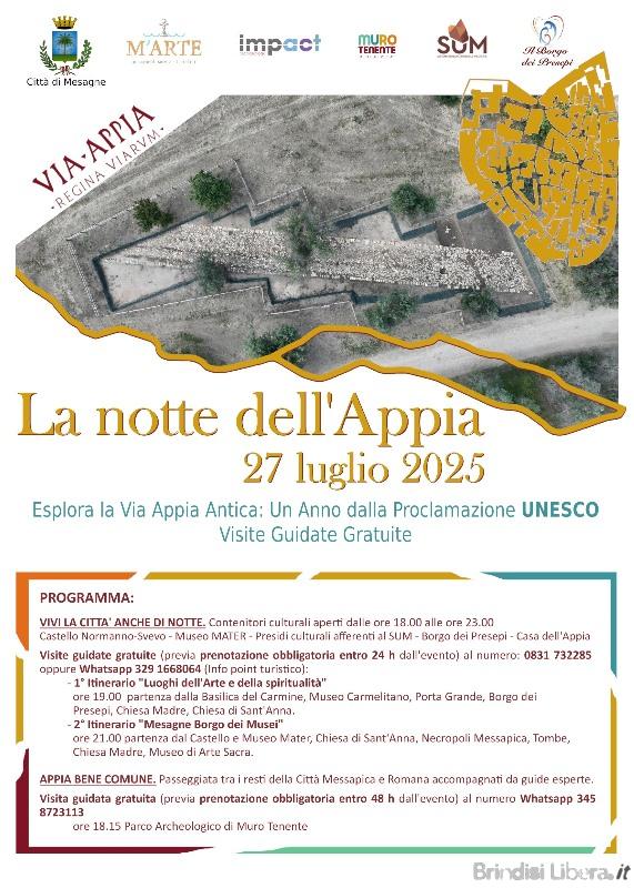 Percorsi culturali a tema e visite guidate gratuite, un’occasione unica per scoprire i “Luoghi dell’arte e della spiritualità”, i percorsi “Mesagne Borgo dei Musei” e “Appia Bene Comune”. Ad un anno dalla proclamazione dell’Antica Via Appia a Patrimonio Mondiale UNESCO, e per onorare al meglio l’impegno che Mesagne ha assunto nella promozione e valorizzazione della Regina Viarum, domenica 27 luglio la città celebrerà il primo anniversario con l’evento “La Notte dell’Appia”. Il programma invita cittadini e visitatori a vivere la bellezza dei più rappresentativi monumenti cittadini.