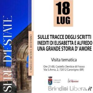 Proseguono gli appuntamenti della rassegna “Sere d’estate in castello” promossa dalla Associazione Le Colonne in collaborazione con il Comune di Carovigno. Venerdì 18 luglio alle ore 21.00 il Castello Dentice di Frasso di Carovigno ospiterà l’evento “Sulle tracce degli scritti inediti di Elisabetta e Alfredo”, una visita guidata tematica che condurrà il pubblico alla scoperta di due figure centrali nella storia del castello: la contessa Elisabetta Schlippenbach e il conte Alfredo Dentice di Frasso.