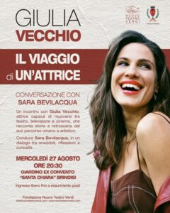 Un incontro dal vivo per ripercorrere tappe artistiche e scelte personali. Mercoledì 27 agosto, alle 20.30, nel giardino dell’ex Convento “Santa Chiara” a Brindisi, Giulia Vecchio sarà protagonista di una conversazione pubblica con l’attrice e regista Sara Bevilacqua: l’iniziativa, organizzata dalla Fondazione Nuovo Teatro Verdi e dal Comune di Brindisi, è a ingresso libero fino a esaurimento posti.