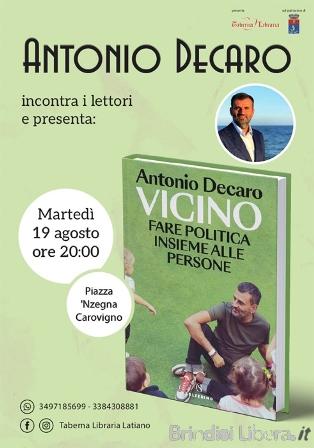 Si parte martedì 19 agosto in Piazza ‘Nzegna a Carovigno con la presentazione del libro “Vicino. Fare politica insieme alle persone” (Editore Solferino) di Antonio Decaro, ex sindaco di Bari e volto noto del panorama politico nazionale, appuntamento patrocinato dall’Amministrazione Comunale della Città della ‘Nzegna.