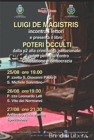 Tre giorni consecutivi anche per la presentazione del libro “Poteri occulti. Dalla P2 alla criminalità istituzionale” (Editore Fazi) di Luigi De Magistris, già magistrato e sindaco di Napoli che sarà possibile incontrare martedì 25 agosto in Piazzetta San Giovanni Paolo II a San Michele Salentino il cui comune patrocina l’evento, mercoledì 26 agosto in Piazza Leonardo Leo a San Vito dei Normanni patrocinato dall’Amministrazione Comunale e giovedì 27 agosto nell’Anfiteatro di Riva Marina località costiera di Specchiolla con patrocinio del Comune di Carovigno.