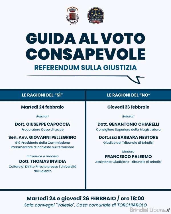L’Amministrazione Comunale di Torchiarolo, di concerto con il comitato civico “Guida al voto consapevole”, promuove presso la Sala convegni “Valesio” della Casa comunale un ciclo di incontri dal titolo “Guida al voto consapevole” per approfondire i temi del prossimo Referendum sulla Giustizia.