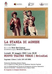 Sono passati quasi trent’anni da quel torrido 19 luglio 1992 che in via D’Amelio, a Palermo, segnò la fine di un simbolo della giustizia, il giudice Paolo Borsellino, e degli agenti della sua scorta. Oggi la memoria di un eroe dell’antimafia diventa uno spettacolo, dal titolo “La stanza di Agnese”, in programma in anteprima nazionale lunedì 30 maggio, con inizio alle 20.30, nel Nuovo Teatro Verdi di Brindisi. Il lavoro, di e con Sara Bevilacqua, per la drammaturgia di Osvaldo Capraro, è prodotto dalla compagnia Meridiani Perduti Teatro con il sostegno del Comune di Brindisi e il supporto del TRAC – Centro di Residenza Teatrale Pugliese -, della Scuola di Formazione Antonino Caponnetto e della Fondazione Nuovo Teatro Verdi. L’ingresso è libero con obbligo di indossare la mascherina FFP2. Info 349 449 0606.