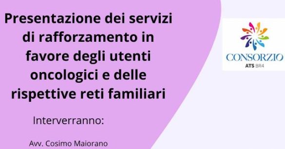 L’iniziativa pubblica è organizzata dal Consorzio ATS BR4 in collaborazione con gli ETS attivi nella realizzazione dei servizi di rafforzamento in favore degli utenti oncologici e delle loro famiglie.