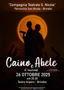 «Caino e Abele» è il titolo del musical che andrà in scena presso il Teatro Impero di Brindisi domenica 26 ottobre alle ore 20.30, realizzato dalla comunità parrocchiale del quartiere Paradiso di Brindisi sull’eterna lotta tra bene e male, tema di estrema attualità, specie tra i giovani. Uno spettacolo è a cura di Piera Penta.